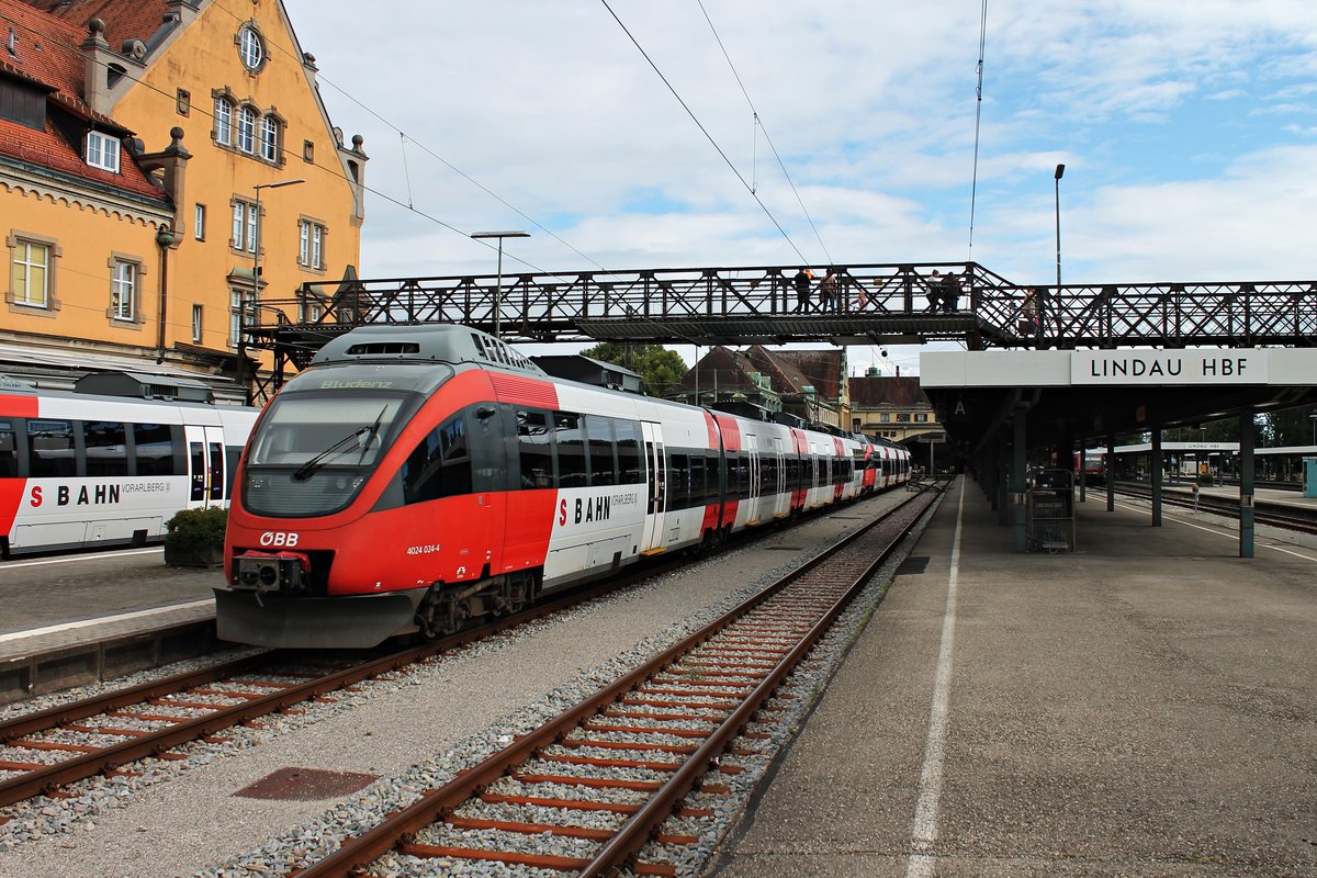 Ein 4024 (Bombardier Talent) erreicht Lindau Hbf über den Bodenseedamm. ? S-Bahn Vorarlberg (ÖBB) ? S1 Bludenz (A)–Lindau Hbf (D) ? Bahnstrecke Lindau–Bludenz (ÖBB KBS 401) ? 7.8.2020 | 17:37 Uhr Clemens Kral Linie S1 S1 Lindau Hbf Bahnhof: FahrpläneFahrplan Lindau Hbf – Klaus in Vlbg Bahnhst Persönlichen fahrplan Lindau Hbf Klaus in Vlbg Bahnhst